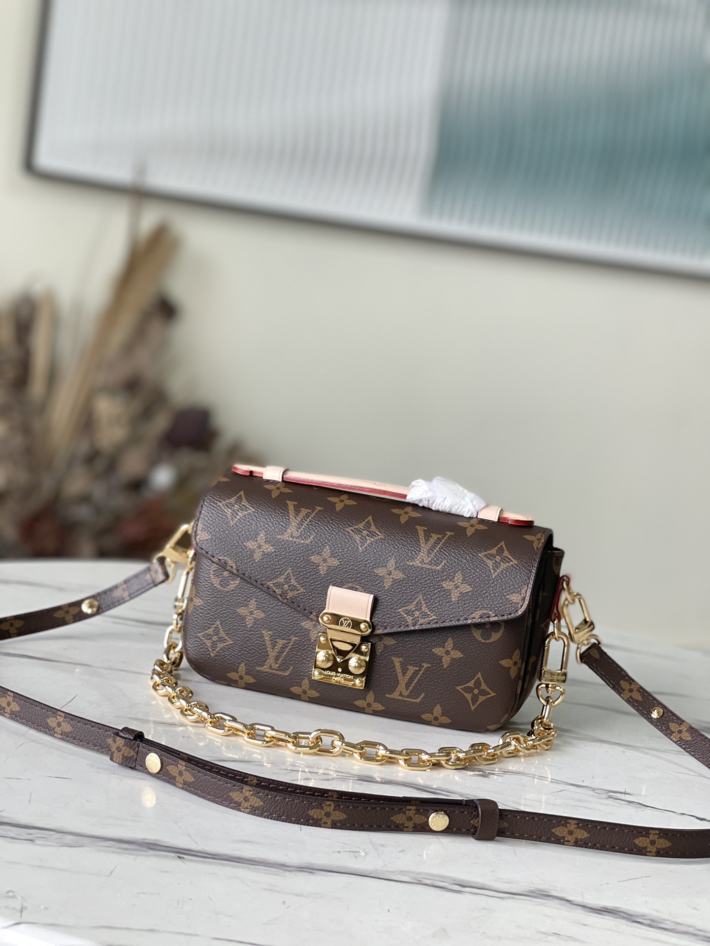 采用经典老花涂层帆布打造包身,搭配标志性S-lock金属锁扣,配有可调节皮革肩带与镀金金属链条两种背带方案,复古耐看的Monogram老花印花,兼具轻奢质感与日常实用性,适合日常通勤、约会穿搭使用,属于高品质超A仿品箱包。