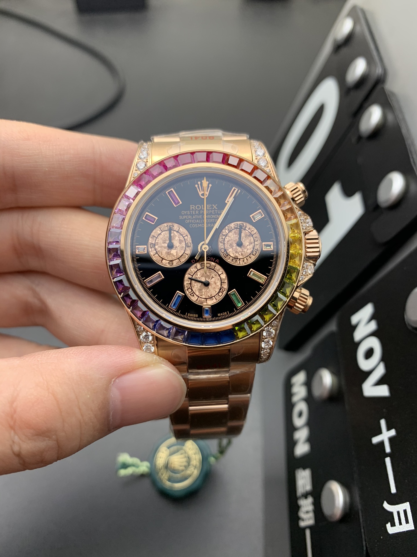 本款为高端超A复刻劳力士迪通拿腕表,采用质感仿真18K玫瑰金表壳,表圈镶嵌彩虹渐变方形宝石搭配侧边碎钻装饰,黑色表盘搭配玫瑰金纹理计时副盘,搭载复刻自动计时机芯,走时精准稳定;炫彩奢华的外观兼具商务正装与休闲穿搭场景,完美还原正品高端质感。