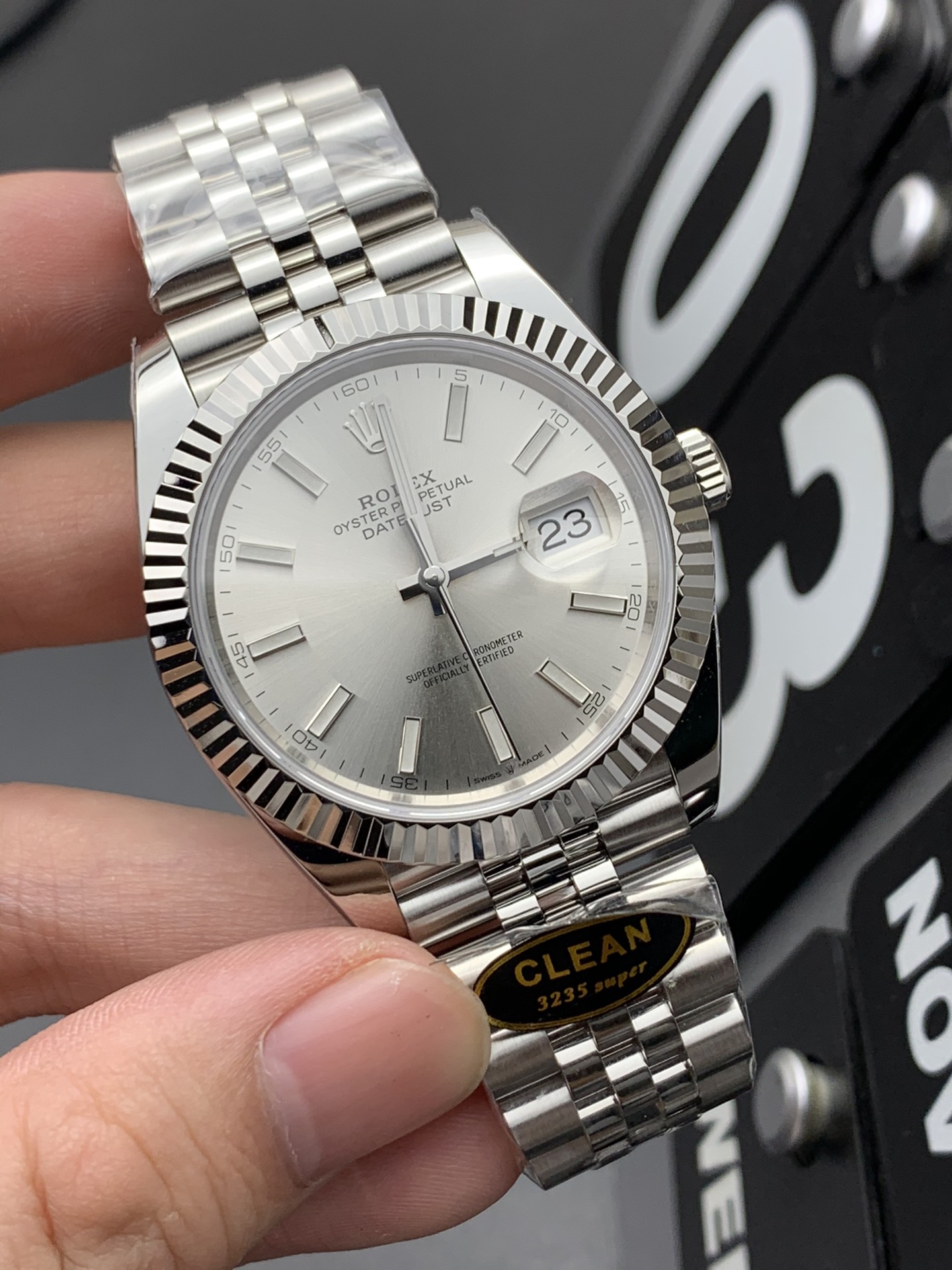 本款为Clean Factory复刻的劳力士日志型腕表,搭载3235超级复刻机芯,采用精钢五珠表带,搭配经典狗牙旋动表圈,银色调放射纹表盘带有日历显示窗口,具备官方认证超级天文台精度,瑞士做工质感,适配商务通勤、日常穿搭等多种场景。