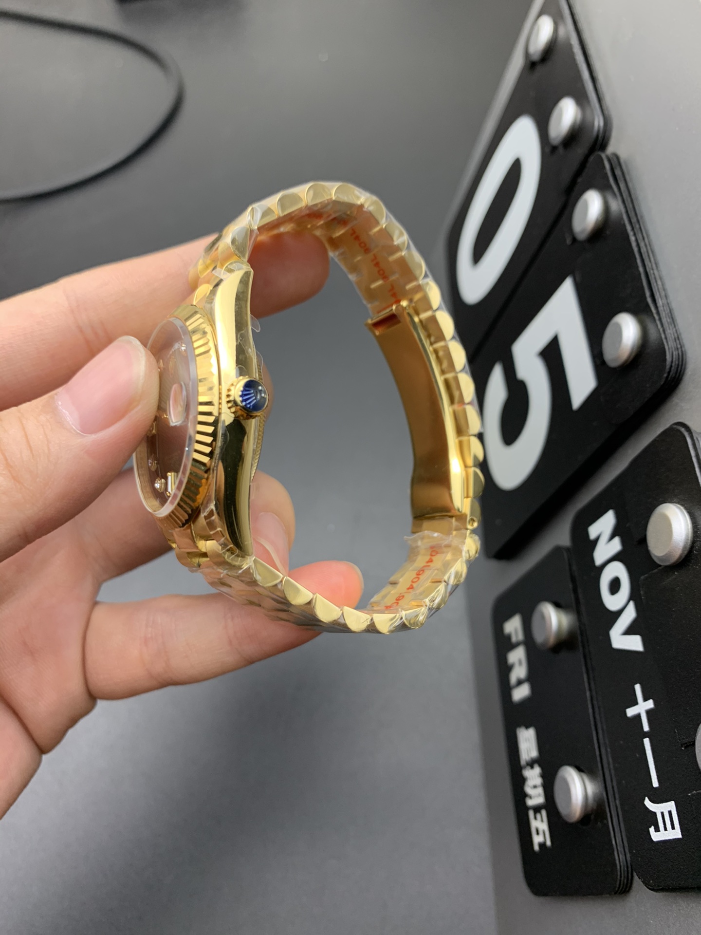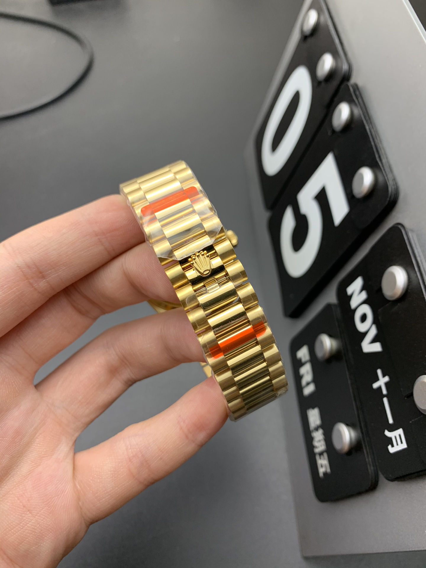 这款劳力士Day-Date腕表采用18K黄金总统链表带,搭配坑纹旋转表圈,渐变绿表盘镶嵌钻石时标,具备星期、日期双显示功能,搭载瑞士官方认证的超级天文台精密机芯,瑞士原装制造,尽显奢华尊贵气质,适配正式商务、高端社交及日常佩戴场景。